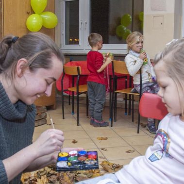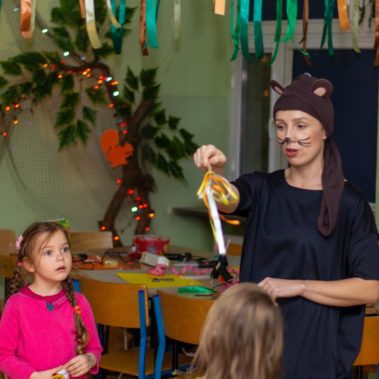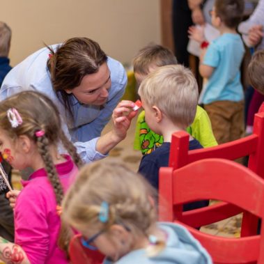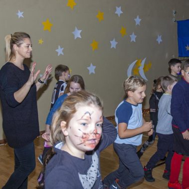 Podczas gdy w pracowniach zawodowych młodzież wykonywała zadania specjalne pod okiem Harrego Pottera, młodszych gości zaproszono do zabawy w cieniu Magicznego Drzewa. Zgodnie z legendą, powalony przez burzę w Dolinie Warty dąb, został przerobiony na przedmioty posiadające niezwykłą moc. Dzieci miały okazję przekonać się o tym na własne skórze zasiadając na czerwonych krzesłach i oddając w ręce wybitnych wróżek wyczarowujących na ich twarzach zgodne z życzeniami malunki. Kolorowy makijaż świetnie prezentował się na leśnym party zorganizowanym w języku angielskim. Wesołe tańce i zabawy w pięknej scenerii lasu z pewnością rozpaliły w uczestnikach zapał do nauki tego języka. W skocznych pląsach odbyła się również rozgrzewka przed zajęciami plastycznymi w zamieszkałym przez chomiczka warsztacie, gdzie młodzi artyści tworzyli z drewna magiczne różdżki i ławeczki. Wielką frajdę zapewnił najmłodszym Berek Czarodziej władający tego wieczoru salą gimnastyczną. Z nie lada łamigłówką dzieci zmierzyły się w sali, w której zamiast żołędzi i liści, z gałązek Magicznego Drzewa spadały zadania i zagadki. Widowiskowe i pachnące czary odprawiono w pracowni chemicznej przearanżowanej tego dnia na bajeczną wytwórnię mydełek.