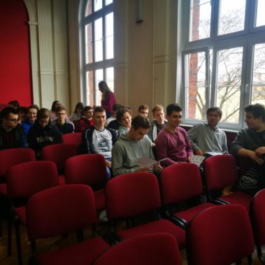 W poniedziałek, 18 listopada, uczniowie marzący o karierze w obszarze IT wzięli udział w wydarzeniu pod hasłem „Zawodowa łamigłówka – od pomysłu do sukcesu!” zorganizowanym przez Stowarzyszenie VIDA ARTIS w ramach Światowego Tygodnia Przedsiębiorczości. Młodzi informatycy wysłuchali wykładu motywacyjnego wygłoszonego przez doradcę zawodowego, p. Macieja Barczaka, oraz uczestniczyli w spotkaniu z projektantem gier komputerowych, p. Mikołajem Kamińskim. Prelegenci, reprezentujący blok tematyczny „MeetGame”, odwoływali się do własnych doświadczeń oraz inspirujących życiorysów osób, które odniosły sukces w branży informatycznej. Przedstawiciel CDZDM zachęcał młodzież do determinacji w realizowaniu celów edukacyjno-zawodowych oraz odważnego podążania za marzeniami. Najlepszym przykładem na to, że warto działać w zgodzie z zainteresowaniami i pasją, było wystąpienie wspomnianego twórcy gier video posługującego się pseudonimem „Sos Sosnowski”. Swoje pierwsze kroki w programowaniu stawiał on jako nastoletni samouk, pracując na domowym komputerze z lat 80 – tych – Commodore 64. Z czasem zaczął tworzyć coraz bardziej zaawansowane gry na coraz to nowocześniejszym sprzęcie, traktując tę aktywność wyłącznie hobbystycznie. W związku z tym, że po liceum nie dostał się na oblegane studia informatyczne, rozpoczął naukę w kolegium językowym. Po ukończeniu studiów pedagogicznych pracował w szkole jako nauczyciel angielskiego. Pasja tworzenia gier nie dawała jednak o sobie zapomnieć, doprowadziwszy go w końcu do decyzji o rezygnacji z posady belfra i całkowitym zaangażowaniu się w projektowanie gier. Uczniowie z entuzjazmem czerpali inspirację, dając się wciągnąć w rozmyślania dotyczące własnych pomysłów na zawodowe życie.