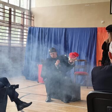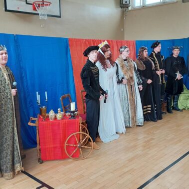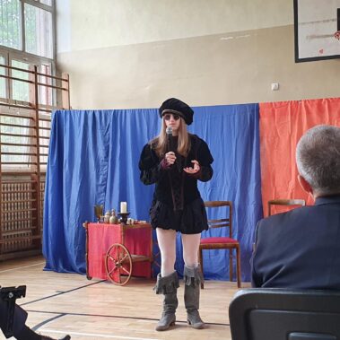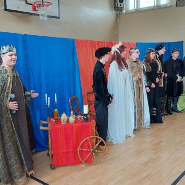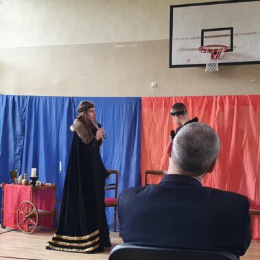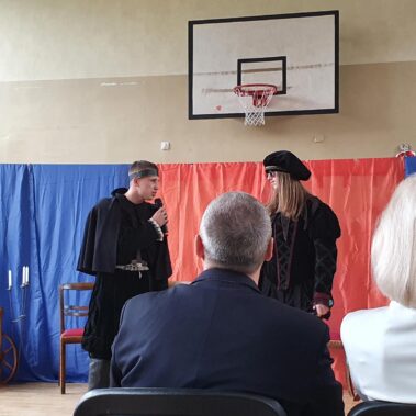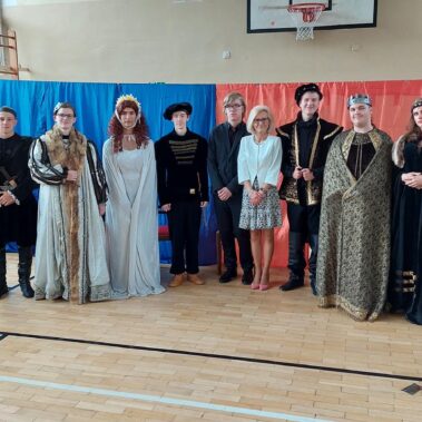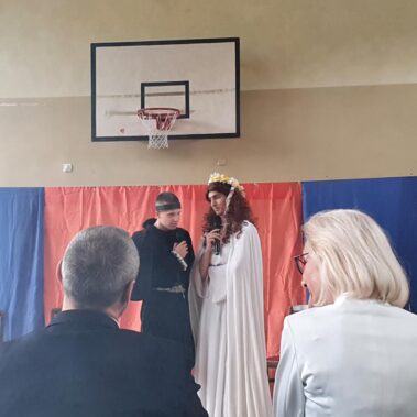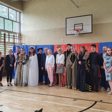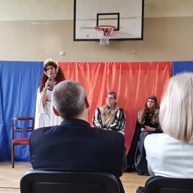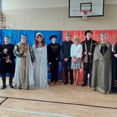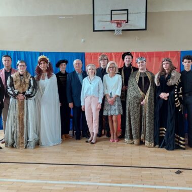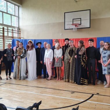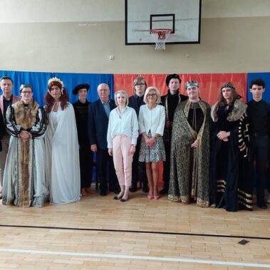 W murach szkoły zagościł szekspirowski bohater …na wesoło . Młodzież zaprezentowała swój talent i zaangażowanie w ,,Trudnych sprawach Hamleta’’. Młodzi aktorzy mieli okazję wystąpić w oryginalnych strojach z przedstawienia ,,Makbet’’, które gościło na scenie poznańskiego Teatru Wielkiego.